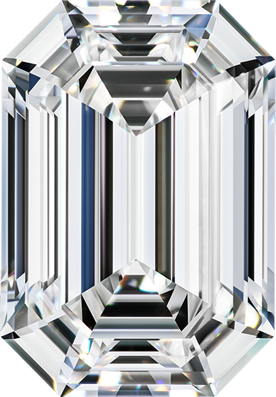 The Emerald Cut Diamond has an elongated, rectangular shape and chipped step cuts, with straight linear facets – arranged parallelly down the stone. Unlike most other shapes that are brilliant cuts, an emerald cut diamond is actually a step cut. Its faceting is not the traditional kite and star shaped facets of other loose diamonds; rather, emerald cuts have small rectangular facets that resemble stairs or steps. Through its long step cuts, the diamond offers abundant reflections both of white and colored light.