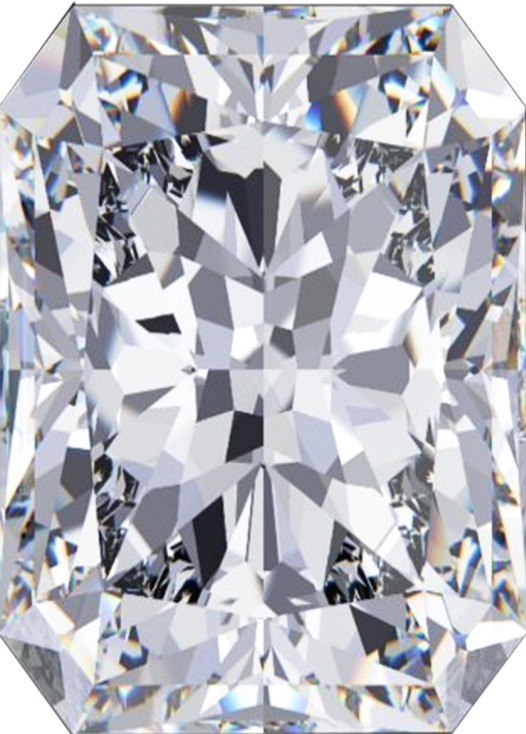 The radiant cut combines the silhouette of the emerald cut with the brilliance and sparkle of the round full cut. It comes in both square and rectangular shapes, typically cut with 70 facets (25 on the crown, 8 on the girdle and 37 on the pavilion), and its corners are beveled. The radiant cut diamond is a beautifully symmetrical, non-traditional cut, and combines the brilliance of a round and the purity of an emerald cut. Unlike the emerald cut which favors diamonds of exceptional clarity, a radiant cut diamond can be more forgiving of inclusions.